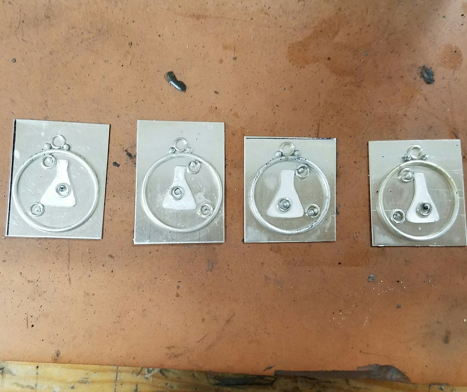 I started playing around with adding small jump rings and granules on and around the flasks to create "bubbles". My final design included 3 sets of bubbles for each flask - which would be fused down on to argentium sheet.